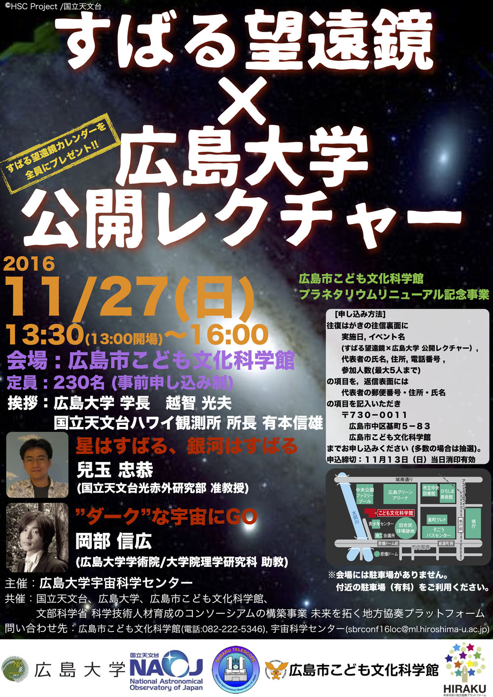 - 「すばる望遠鏡X広島大学 公開レクチャー」を開催します (広島大学 2016年10月4日 お知らせ)