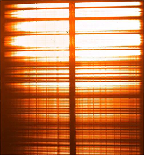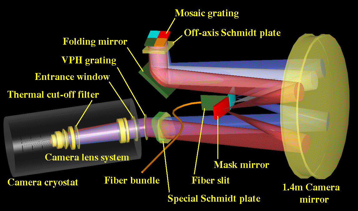 FMOS InfraRed SpectrographsThe 400 fibers at the prime focus are optically linked with the two InfraRed Spectrographs (IRS1 and IRS2) on the floor two levels above the Nasmyth platform., each of which makes spectra of 200 fibers. The spectral coverage of the spectrograph is from 0.9 to 1.8 microns with an OH airglow suppression mechanism. The spectrographs are operated with cooled down to -50 ~ -60 degC, to reduce the thermal radiation.The layout of the optics and light path are shown in Fig. 1: The divergent beam from the fiber slit is collimated by the 1.4m-diameter main mirror, is dispersed by the primary grating (4 pieces are mosaiced), and high resolution (R=2200) spectra are formed by the main mirror onto the curved mirror with masks for OH airglow supression. These spectra are re-collimated by the main mirror, go to the camera section and are re-imaged on the detector. The spectral coverage in this high resolution (HR) mode is ~0.2um between 0.9um and 1.8um. By moving the camera dewar, observers can select one of the four bands ("J-short", "J-long", "H-short", and "H-long"). In the Low Resolution (LR) mode, the Volume Phase Holographic (VPH) grating is inserted at the quasi-pupil position in front of the camera. This VPH grating then works as an anti-dispersing element and low resolution spectra from 0.9um to 1.8um are formed on the detector.