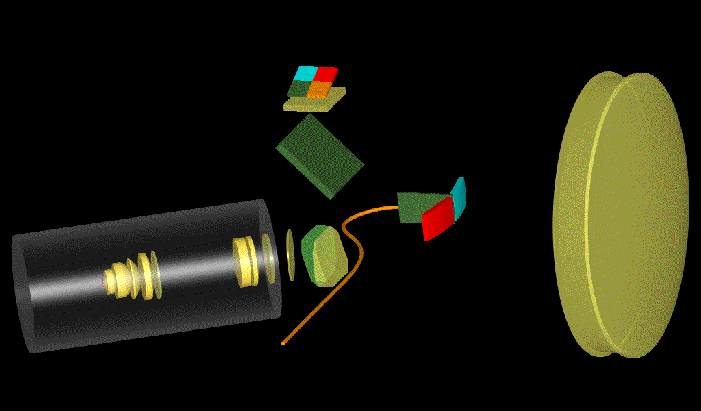 Fig. 1 - (Left) Optics layout and light path in the FMOS spectrograph. (Right) Same as left, but the light path is shown by animation. Below are some spectra of lamps having been taken in engineering works: