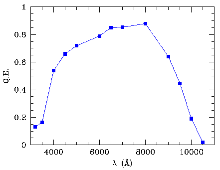 Suprime-Cam CCDs (MIT)The information of this page is about MIT CCD, which is used for Suprime-Cam till 2008/07.Suprime-Cam has ten MIT/LL 2048x4096 CCDs arranged in a 5x2 pattern, providing a field of view of 34' x 27'. The following plot shows the quantum efficiency of a typical CCD. Small gaps exist between the CCDs due to the coplanarity requirement at the prime focus of Subaru Telescope. The following diagram indicates the approximate sizes of the interchip gaps. Note that the left-top chip has a lower Q.E. (about 60%) than the other chips.
