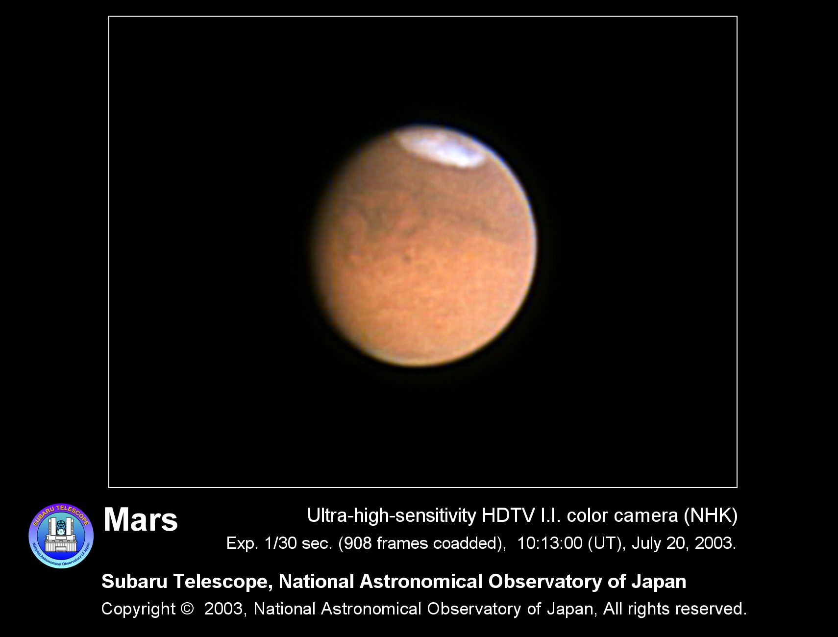 ハイビジョンカメラによる 可視光で見た火星 (7月20日観測) 低解像度 (58 KB) 高解像度 (408 KB) |