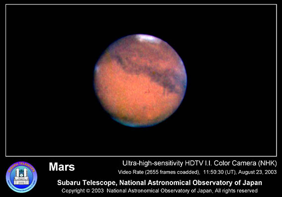 ハイビジョンカメラによる 可視光で見た火星 (8月23日観測) 低解像度 (48 KB) 高解像度 (313 KB) |
