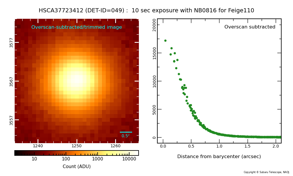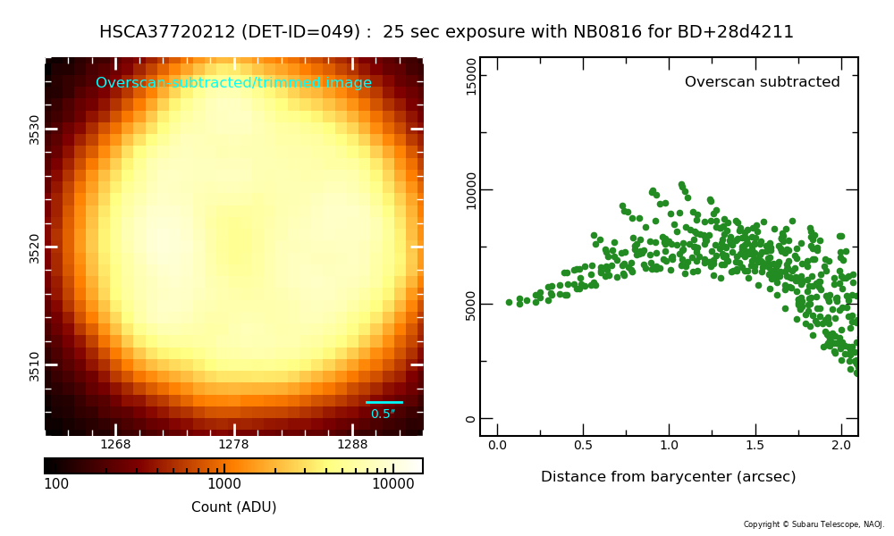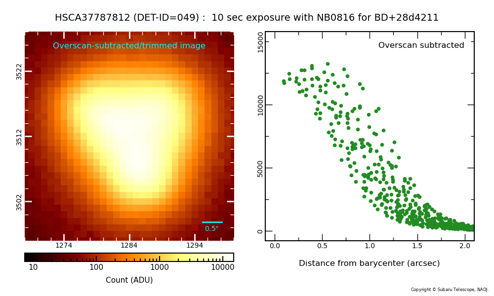 | Domeflat in NB0816 | 35935800 – 35937757 | Obtained with the top-ring flat lamps Read-out failure in CCD #021 and stripe-like noises on the neighbor CCDs Cable-tie shadows on CCD #003 |