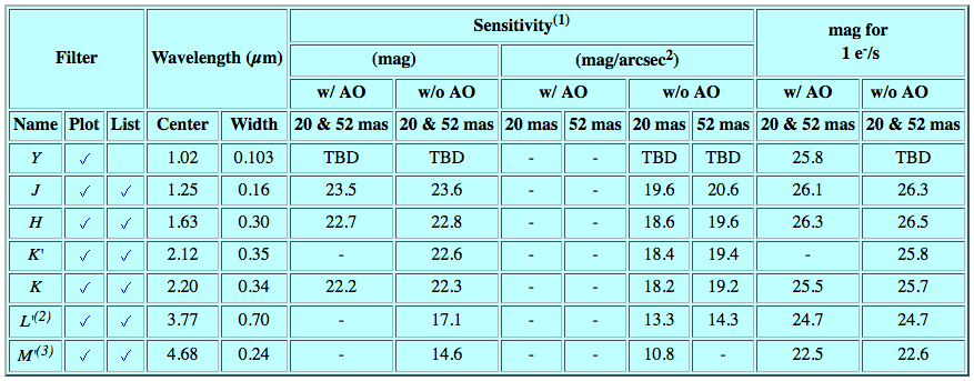 The following table lists the filters available in the camera section of IRCS, together with their sensitivities. The transmission curves of each filter are available as plots or ASCII lists (lists kindly provided by Alan Tokunaga of the IRTF) if indicated in the respective columns.