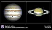 太陽系第2の大きさの惑星で、直径は地球の約9倍ある。木星と同様に赤道に平 行な縞模様があるが構造はより単純である。有名な輪を持ち、その直径は本体の 2.26 倍ある。輪は3重になっていて外側から A環、B 環、C 環と呼ばれている (C 環 は淡いのでこの画像には現れていない)。A 環と B 環の間に、発見者にちなんでカシニの空隙と呼ばれるすきまが見える。青、緑、赤の画像は、それぞれ世界時 6時22分、6時27分、6時34分に取得。