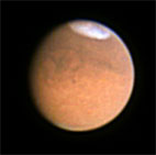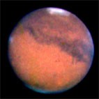 近赤外線分光撮像装置 IRCS は、波長が1~5マイクロメートルの近赤外線を観測する装置です。火星が地球に大接近した2003年8月27日、すばる望遠鏡に取りつけた IRCS によって、火星をとらえることに成功しました。視直径は約25秒角 (1秒角は3600分の1度) です。下のNHK超高感度ハイビジョンカメラによる可視光で見た火星と色や模様が異なるのは、観測日時と観測した波長が違うことによります。