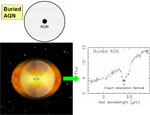 (http://www.naoj.org/Pressrelease/2000/03/24/j_index.html) shows strong 3.3 micrometer olycyclic Aromatic Hydrocarbon emission (PAH). PAHs consist of benzene-like carbonaceous olecules, and are known to be widely distributed in the interstellar medium of galaxies. Image credit of M82: National Astronomical Observatory of Japan. (b): A buried active supermassive black hole displays no PAH emission. Only smooth continuum emission and strong dust absorption features are found. The absence of the PAH emission is caused by the destruction of PAH molecules by radiation from the active supermassive black which is more energetic than radiation from active star-formation regions. The observed absorption feature at 3.4 micrometers in this figure originates in carbonaceous dust grains.(Larger Image:(a), (b) )