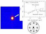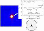 Figure 4: Examples of observed ultraluminous infrared galaxies. (a): An infrared K-band (2.2 micrometers) image (Left; 10 arcsec field of view, North is up and East is to the left) of the ultraluminous infrared galaxy IRAS 14060+2919, and its infrared 3-4 micrometer spectrum. Strong PAH emission is observed, suggesting that active star-formation is responsible for the infrared luminosity of this galaxy. Although the observed wavelength of the PAH emission is shifted to longer (redder) wavelength because of the redshift (Note 8) of this galaxy, the spectrum is shown with the effect of the redshift removed. (b): A K-band image and 3-4 micrometer spectrum of another ultraluminous infrared galaxy IRAS 12127-1412. No PAH emission and strong dust absorption are detected, indicating that an active supermassive black hole dominates the luminosity of this galaxy. An absorption feature at 3.05 micrometers is found, because some fraction of absorbing dust is covered with ice. (c): A K-band image and 3-4 micrometer spectrum of another ultraluminous infrared galaxy IRAS 17044+6720. Both active star-formation and buried active supermassive black hole are thought to contribute to the observed infrared emission from this galaxy.(Larger Image:(a), (b), (c) )