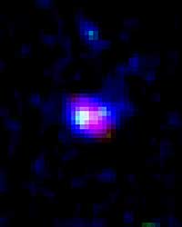 図1: ヒミコの擬似カラー合成写真。青と緑は、ヒミコから出された水素輝線と紫外線です。 (それぞれ、すばる望遠鏡により得られた狭帯域およびz'バンドのデータに対応しています。) 赤は、ヒミコが放つ可視光線を表しています。 (スピッツァー宇宙望遠鏡の3.6μmデータに対応しています。) |