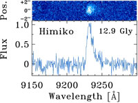 研究チームは、くじら座の「すばるXMMニュートンディープフィールド」にあるすばる望遠鏡の可視画像から207個の遠方銀河候補を選び出しました。その中の1つにヒミコは含まれていました。研究チームはKeck望遠鏡のDEIMOS分光器とカーネギーのマゼラン望遠鏡IMACS装置により分光観測を行い、得られたスペクトルを元に距離を測りました。遠方銀河候補の中にあって、ヒミコはずば抜けて明るく大きい天体でした。「ヒミコは遠方銀河にしてはどう見てもおかしかったですよ。研究者の常識からは、こんなに明るくて大きい天体は、とても本当の遠方銀河とは思えませんでした。たぶん、測定エラーのためにサンプルに紛れ込んだ手前の銀河だろうと。こんな天体を分光観測して貴重な望遠鏡時間を潰してしまうのはもったいないので、ヒミコを分光観測のリストから一度は外しました。でも、万一これが本物の遠方天体だったら、、、と思い留まって、とりあえずヒミコを分光観測することにしました。得られたスペクトルには非常に遠い天体にしか見られない水素輝線があり、これによりヒミコが並外れて遠い距離にあることが分かったのです。驚いたのは、我々からの距離が129億光年!にも達していたことです。」