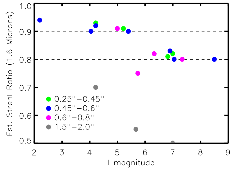 Important note: Strehl Ratio values derived from AO telemetry. Due to non-linearities in WFS and DM, as well as imperfect WFS photon noise calibration, the values quoted here are approximate.