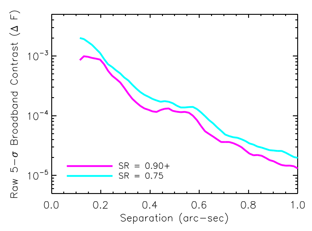 Raw 5-sigma broadband contrast obtained for stars at S.R. ~0.75 and 0.9 (corrected for finite sample sizes). Towards the highest Strehl ratios, the raw contrast curve is nearly flat from 0.3” to 0.6”. The curves are computed by measuring, at each radius, the surface brightness standard deviation (assumed here to be the noise), and multiplying it by 5.