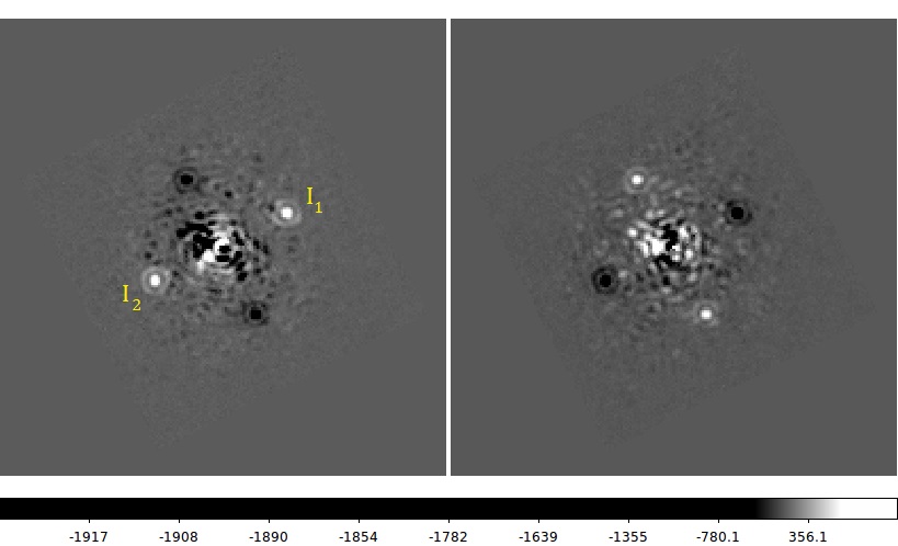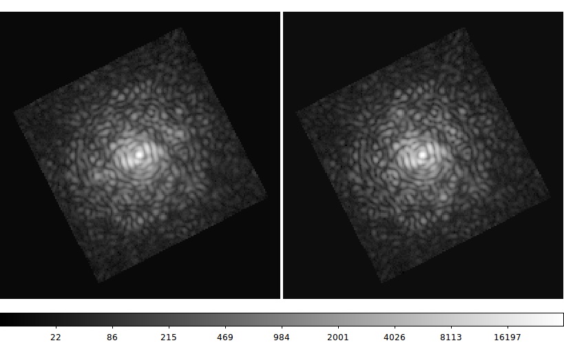 On-sky calibration photometric and astrometric precision has been estimated by measuring the flux ratio and relative position between calibration spots. Numbers are shown in the table below, and indicate the astrometric and photometric calibration precision for bright targets. Photon noise and readout noise may dominate on faint targets. Precision scales as the inverse square as exposure time.Astrogrid calibration precision (measured on star Beta Leo with 8.8nm DM modulation, 30mn observation) | ||