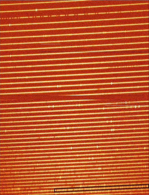 Figure 1: Raw data of the high-dispersion optical spectrum (called an "Echelle format") of Comet ISON, obtained by HDS mounted on the Subaru Telescope with an exposure time of 20 minutes. A lot of gas emissions e.g., C2, NH2, H2O+, O, Na, were detected in this spectrum. To compare these observational results with those of Comet LINEAR (C/1999 S4), also obtained by HDS, go to the following link:http://www.naoj.org/Introduction/instrument/img/HDS_s4_2.jpg).