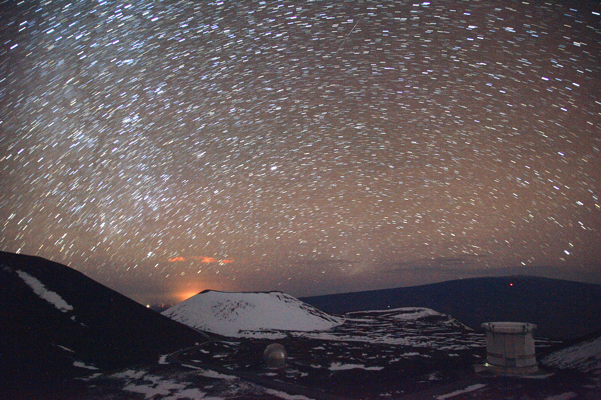 Figure: The Large Magellanic Cloud (LMC) photographed from the top of Maunakea. It appeared at very low elevation toward south slightly above the flanks of Mauna Loa in this image taken on February 12, 2017. In the front is a snow-capped pu'u (cinder cone). The red glow to the left (east) comes from lava lake of Kilauea volcano's summit crater. Image without circle is here. (Credit: NAOJ/Ichi Tanaka)