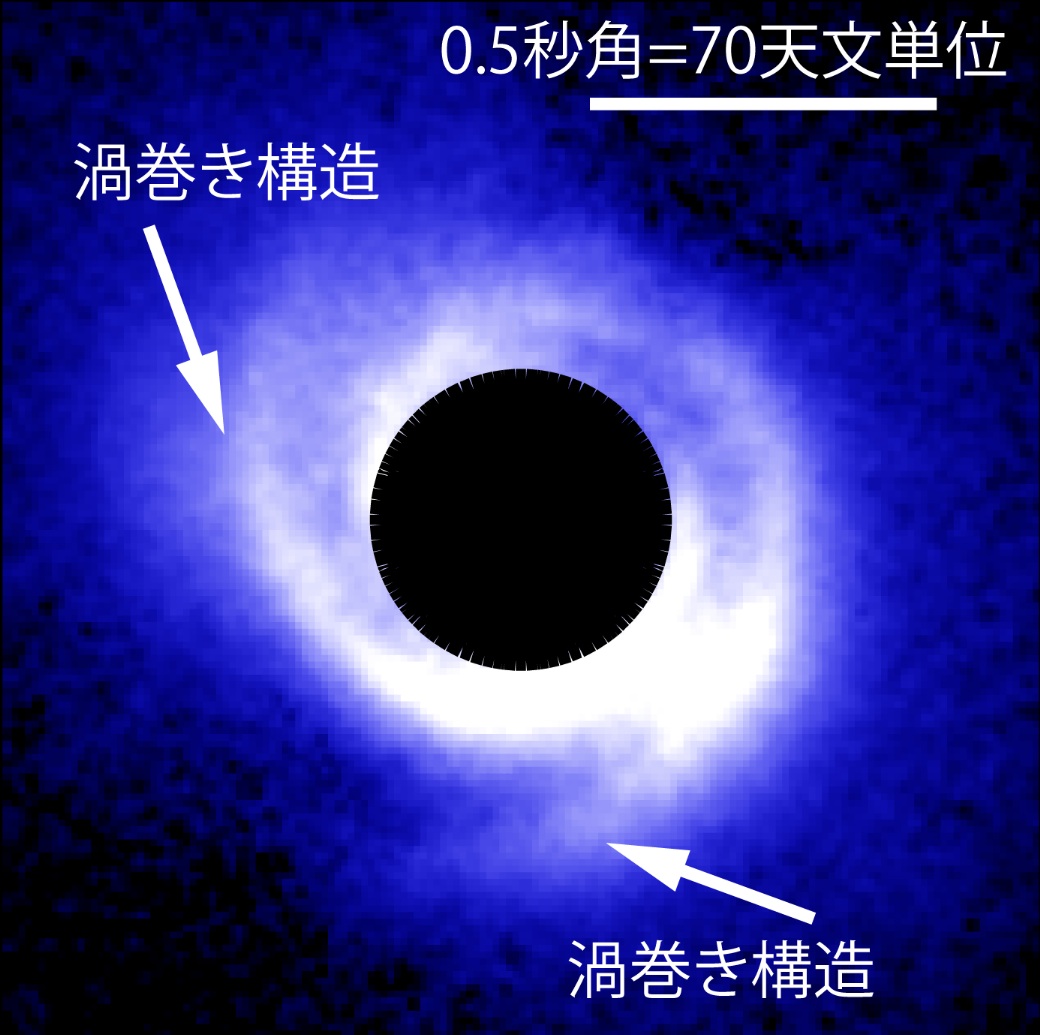 図1:すばる望遠鏡搭載の HiCIAO で得られた SAO 206462 周囲の円盤の近赤外線画像。中心部分は、コロナグラフのマスクで隠して観測しているので、黒く塗りつぶしてあります。そのほかの部分は、黒い部分が暗く、青から白の順に明るく光っている部分を示しています。また、図の右上には長さのスケールが示してあります。矢印で示すように、渦巻き状の構造がはっきりと見えています。図をクリックすると拡大図が表示されます (ラベル無し拡大図)。(クレジット:国立天文台)