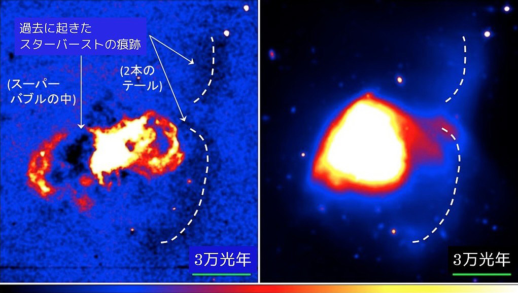 図2に示した Hα の輝線領域は従来の観測で検出されていたもので、「8」の字を横倒しにした構造はスーパーウインドが吹いている領域です。まだスーパーウインドが壊れておらず、二つの泡構造のように見えています (スーパーバブル構造と呼ばれます)。