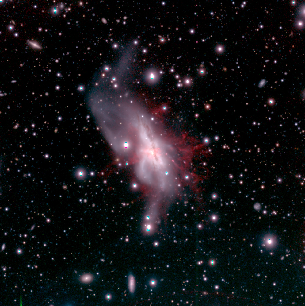 研究チームはこの重要な天体のスターバーストの歴史を解明するために、すばる望遠鏡主焦点カメラ Suprime-Cam を用いた観測を行いました。電離ガスから放たれる水素の光 (Hα 輝線) を選択的に通す特殊なフィルターを使って観測することで、銀河風の詳細な構造を明らかにしようとしたのです。