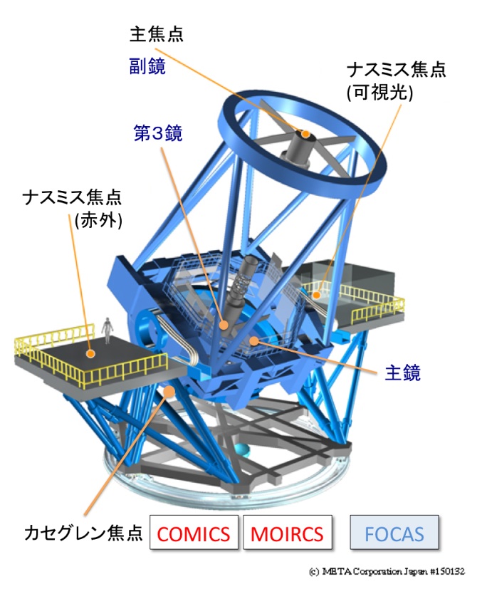 図:すばる望遠鏡本体とカセグレン焦点の観測装置。共同利用観測を再開したカセグレン焦点では、冷却中間赤外線分光撮像装置 (COMICS)、多天体近赤外撮像分光装置 (MOIRCS) を用いた観測を行うことができます。従来は微光天体分光撮像装置 (FOCAS) での観測も可能でしたが、冷却液漏れの影響を受けたために現在は望遠鏡から取り外し、状況の調査・修理を進めています。 |