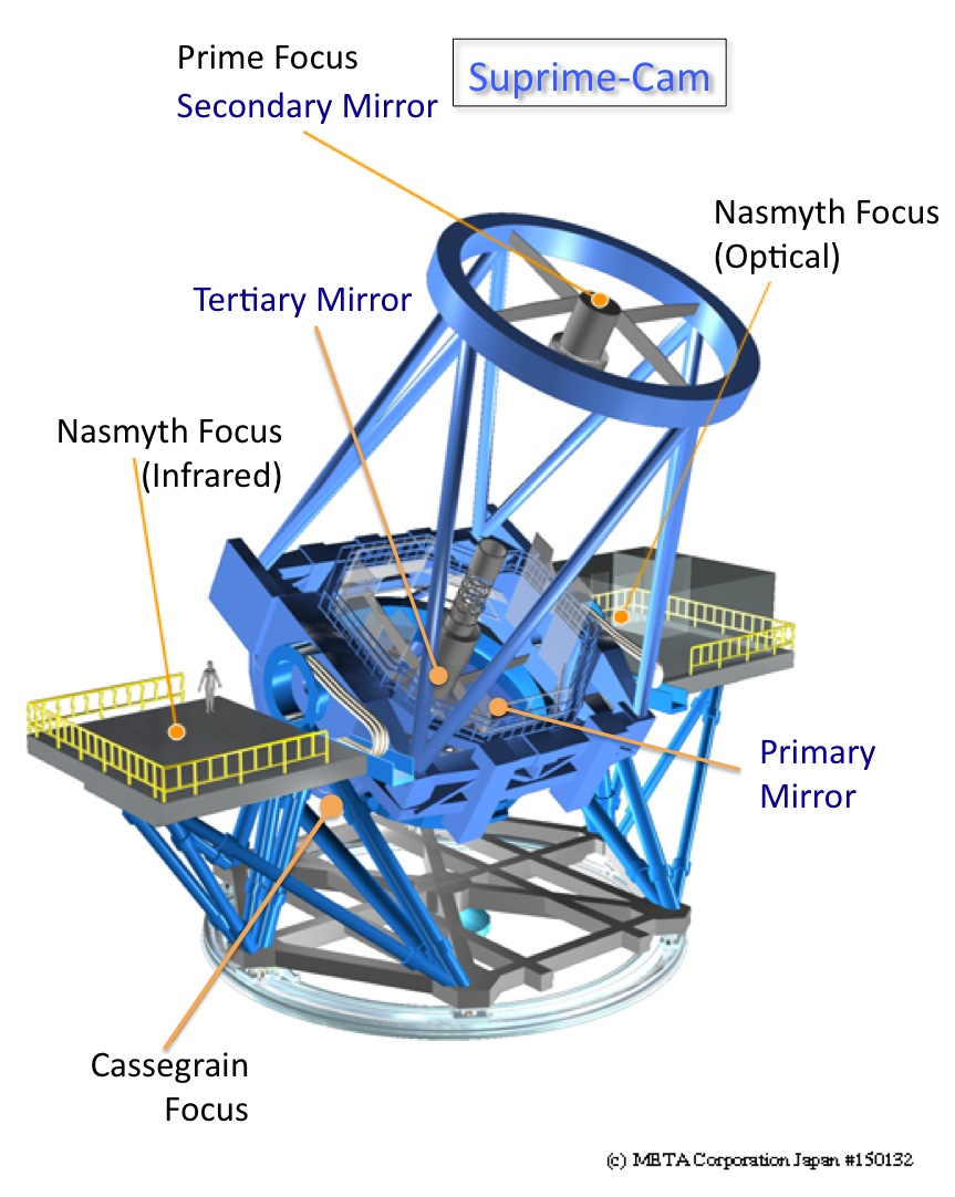 The prime focus unit consists of an auxiliary system, an instrument rotator, and an active cable wrap system. Several instruments can be mounted at prime focus: Suprime-Cam, Hyper-Suprime Cam, and FMOS (Faint Multi-Object Spectrograph). One of the secondary mirrors can also be mounted at prime focus to assist in observations at other focal points.
