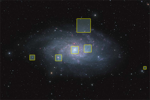 M33 is the next nearest spiral galaxy to the Milky Way after the Andromeda Galaxy. The field of view of this image, which was taken by the Suprime-Cam attached to the Subaru Telescope, is about eight times of the size of a single Suprime-Cam shot. It covers an area of sky about eight times the size of the full Moon. Individual stars, star associations, star-forming regions, and dark nebulae can easily be seen in the image.