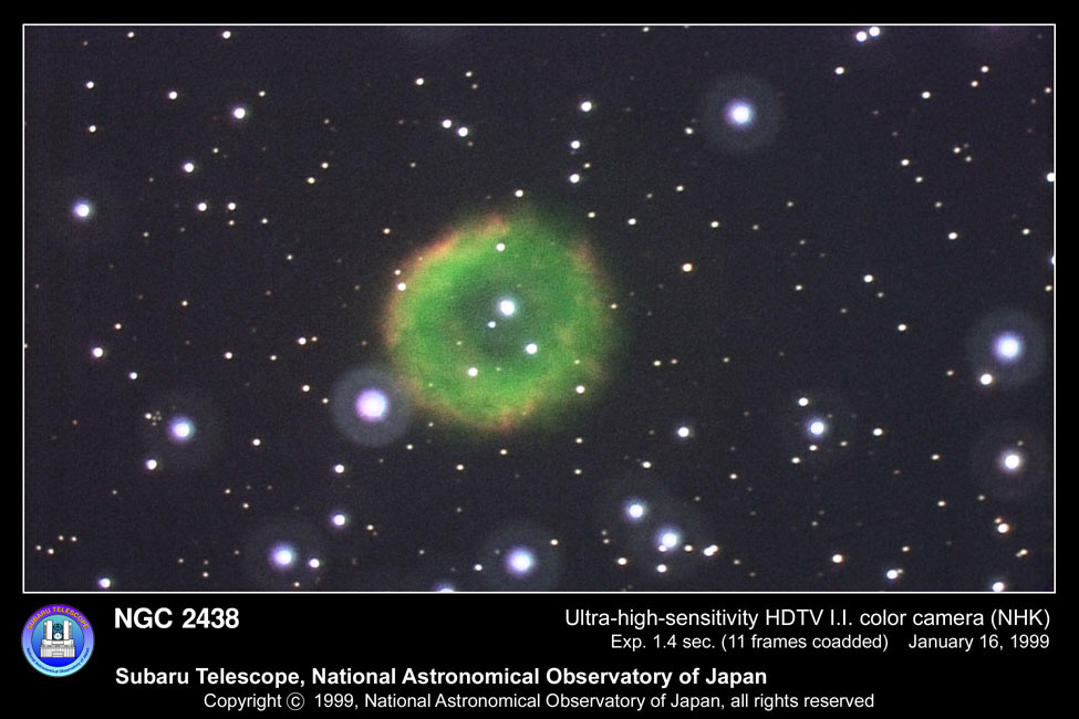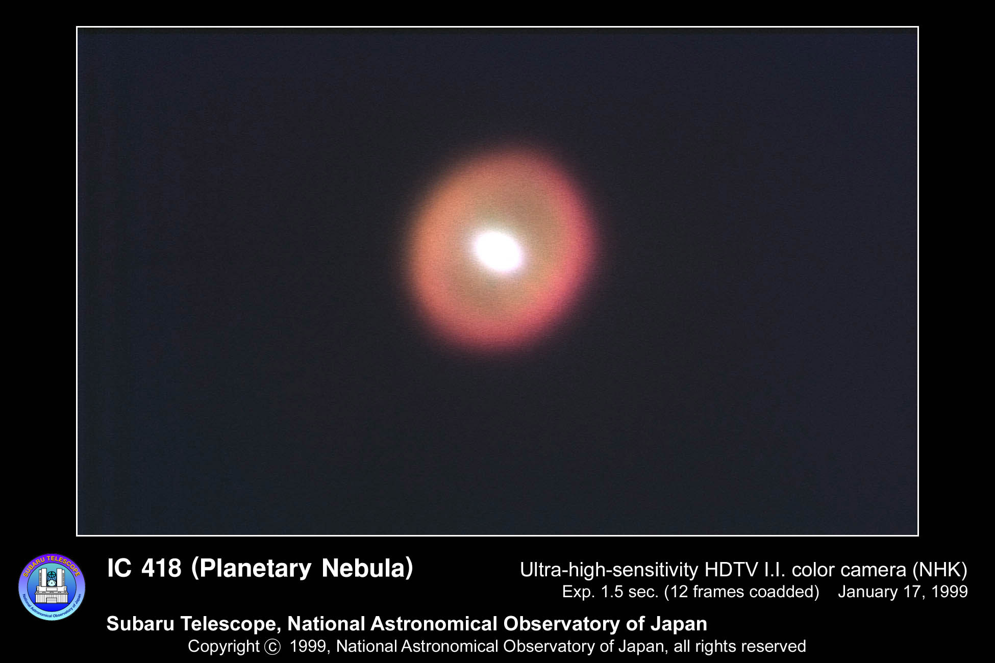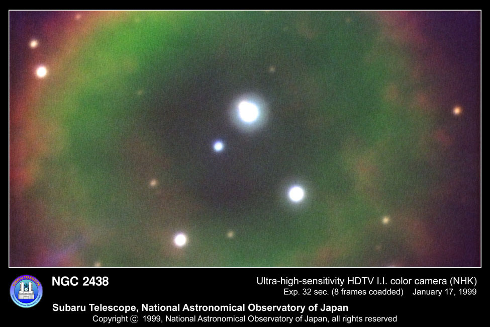 Distance : 1300 Light years Constellation : Lepus Detail : The white dwarf, from where the gas of this nebula came from, is not at the center of the nebula but is shifted to the left. It is thought that this is because of the irregular stellar wind that comes from the white dwarf. |