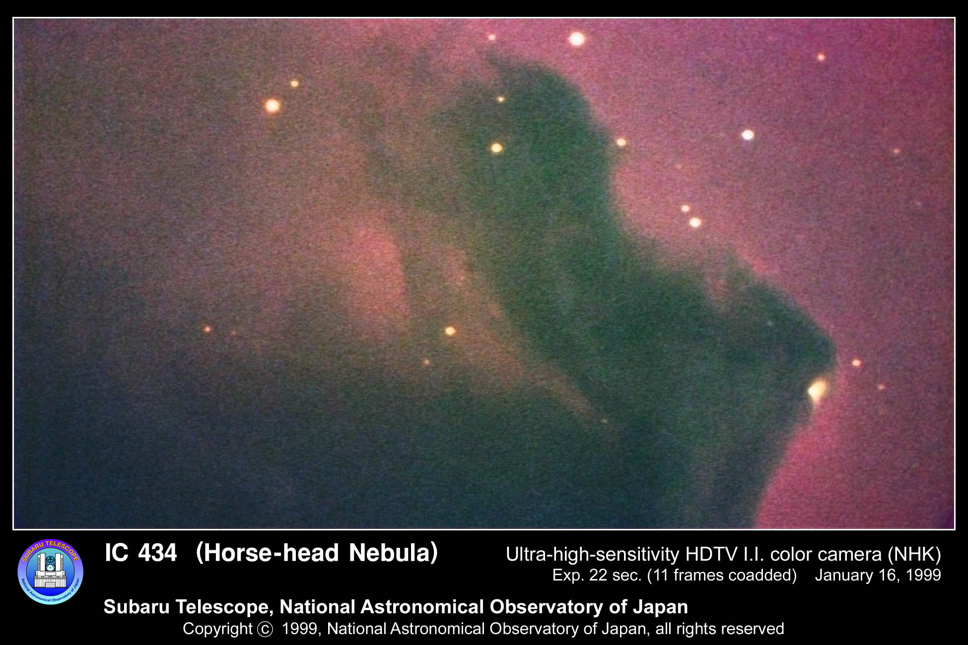Distance : 1300 Light years Constellation : Orion Detail : Dark nebula is blocking the light of the stars behind it creating a silhouette that looks like a horse' head. |
