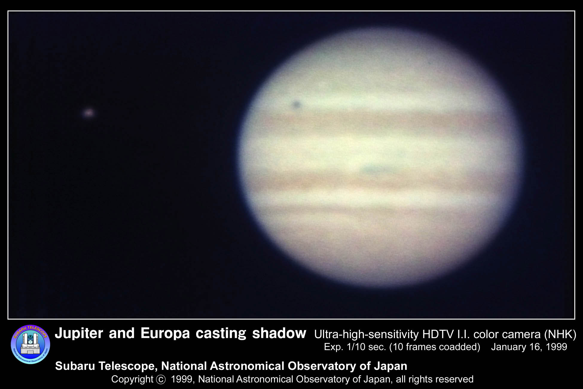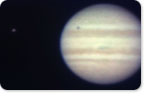 Distance : aprox. 8 x 108 km Detail : Jupiter, the biggest planet in the solar system, and one of its larger moons,Europa, are both captured in this image. The dark spot on Jupiter's northern hemisphere is the shadow of Europa. [ More ] |
