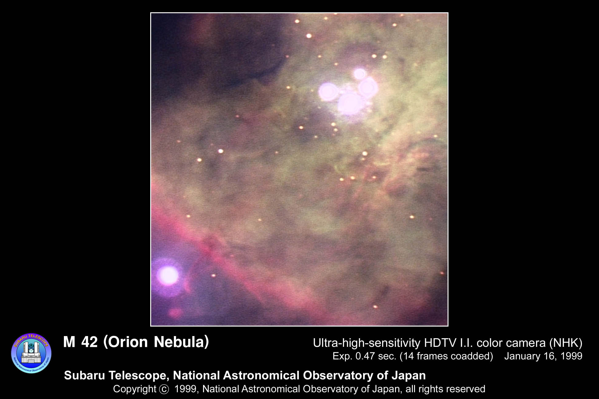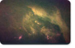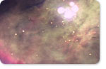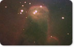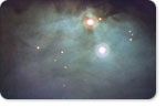 Distance : 1500 Light years Constellation : Orion Detail : This is just center region of the vast Orion nebula. The four bright stars in the upper right corner are called the "Trapezium". They are newborn stars made with a higher concentration of heavy elements. [ Scientific Result ] |