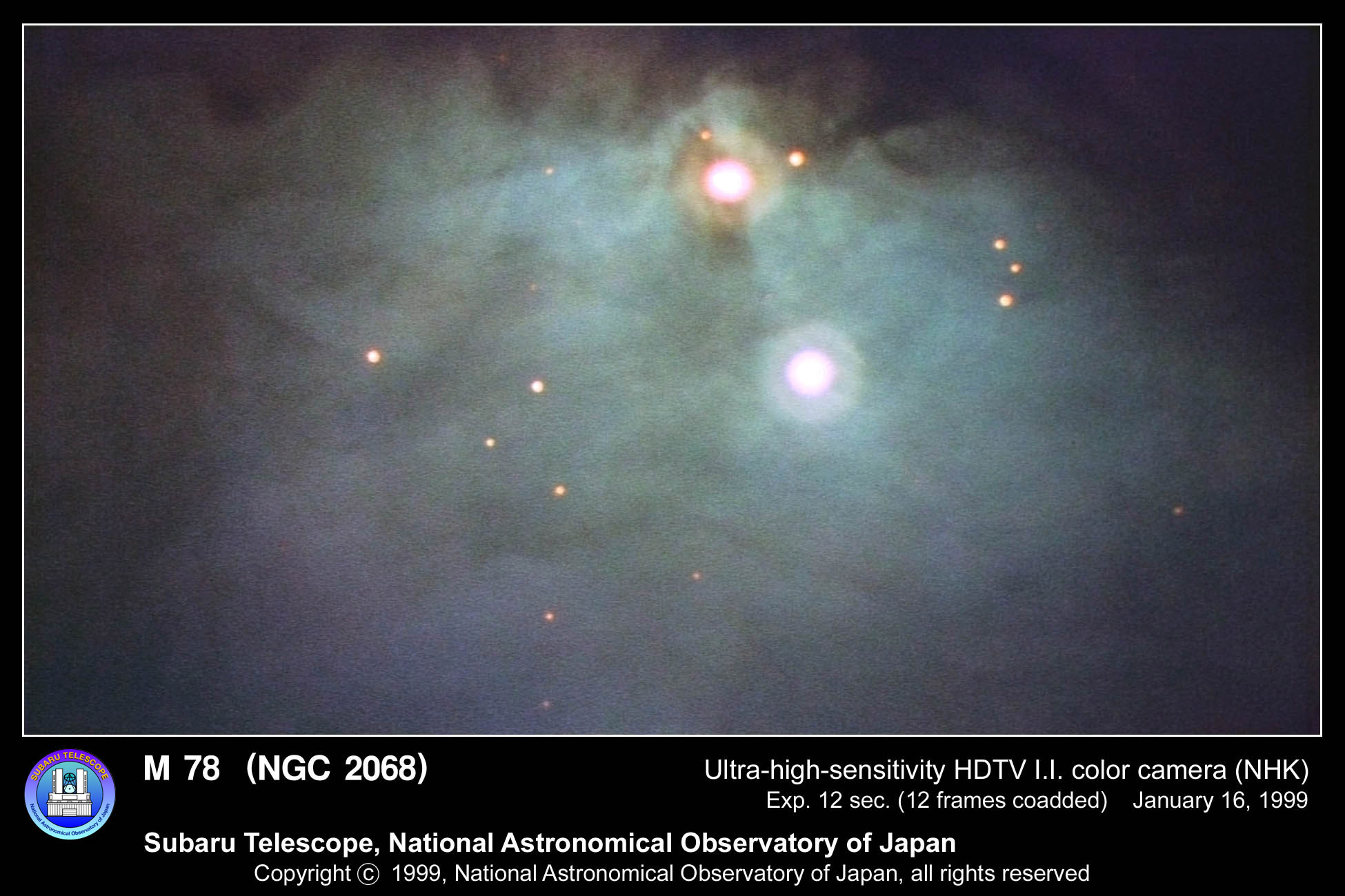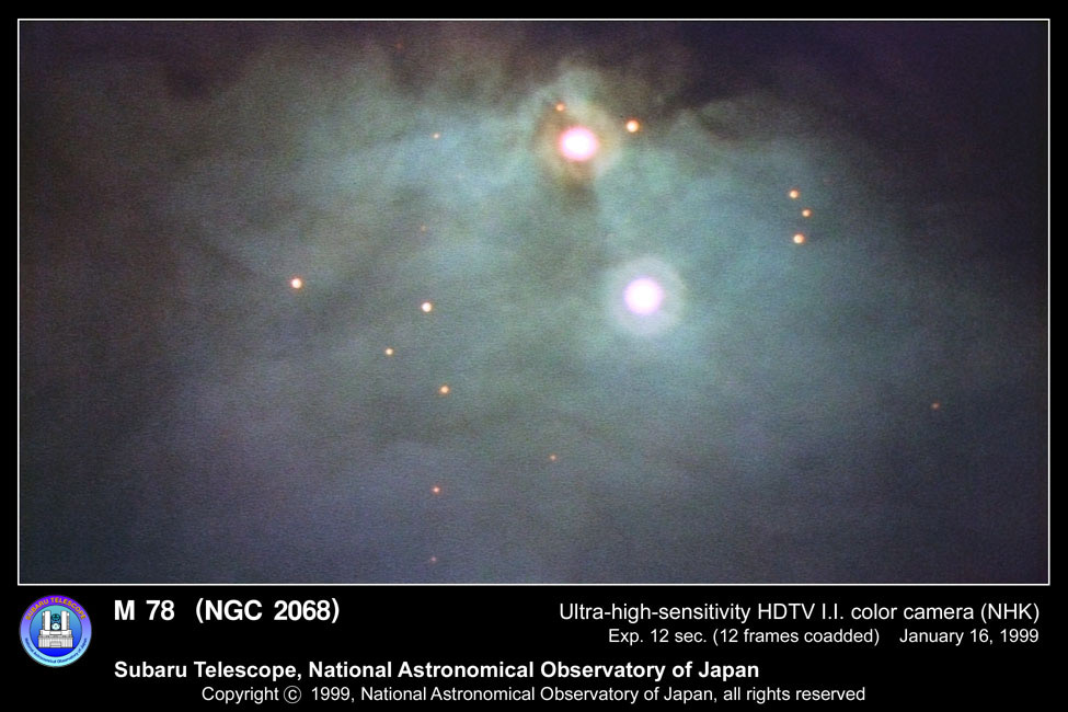Distance : 1600 Light years Constellation : Orion Detail :White light passing through a nebula will have its blue light filtered and scattered more readily than its red light. Since M78 looks blue, the light comes from a star located to the side of it and is called a reflection nebula. |