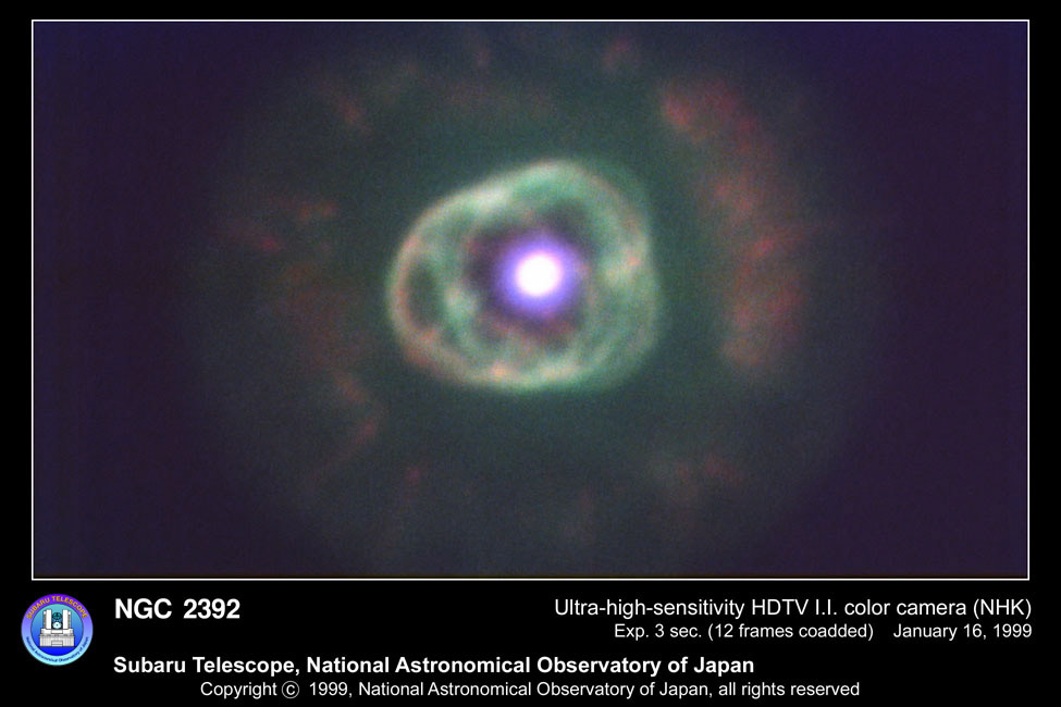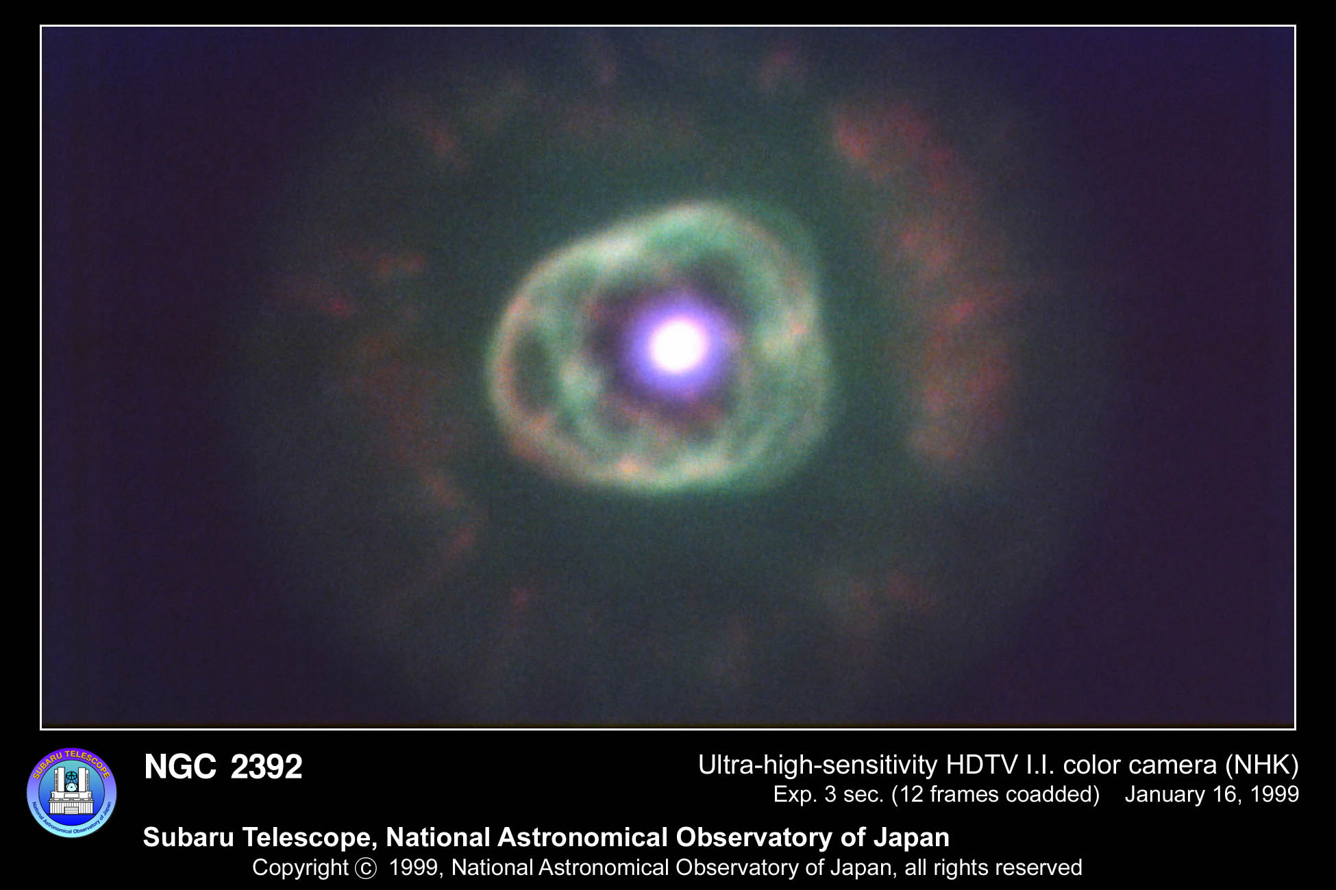 Distance : 1360 Light years Constellation : Gemini Detail : One of the most famous planetary nebulae. This object looks like an Eskimo that is wearing a fur hat, hence why it is known as the "Eskimo Nebula". |