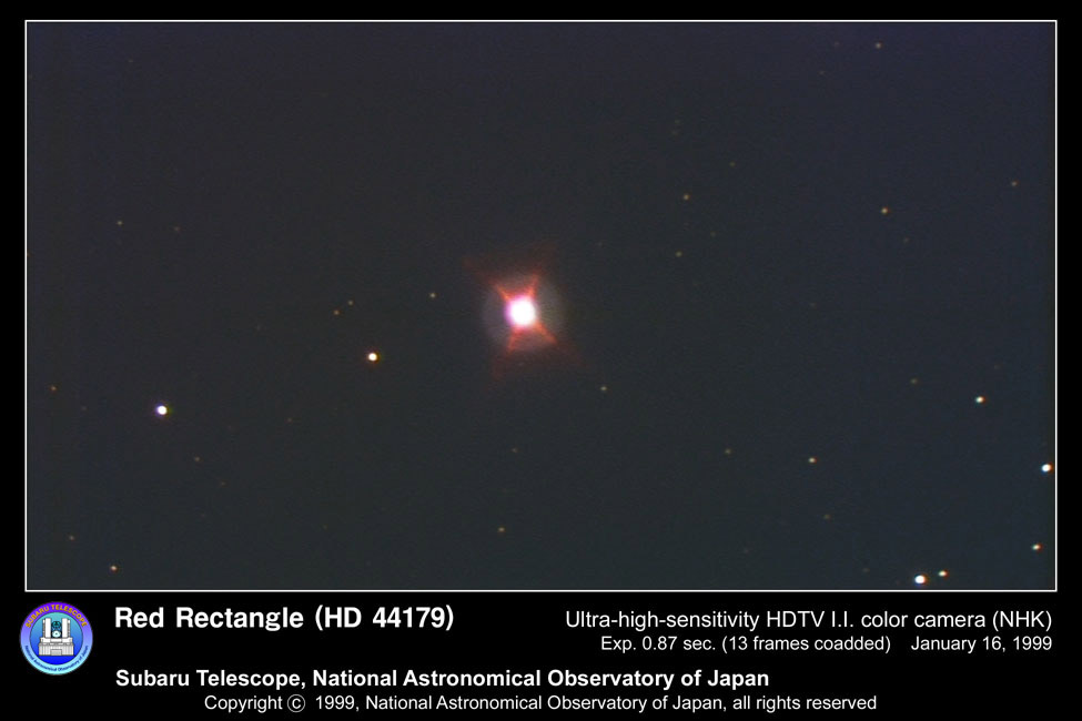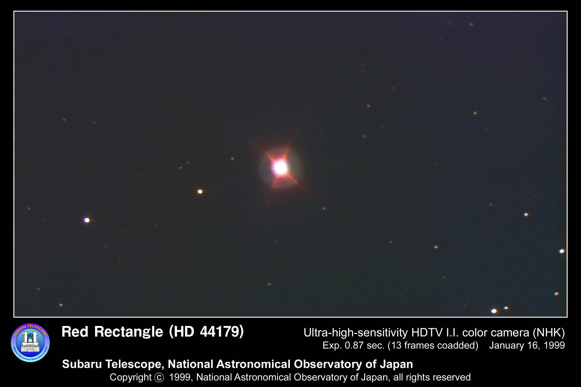 Distance : 2300 Light years Constellation : Monoceros Detail : This star is a red giant at the moment and it will end its life when it turns into a planetary nebula. The name " Red Rectangle" comes from the star's appearance. |