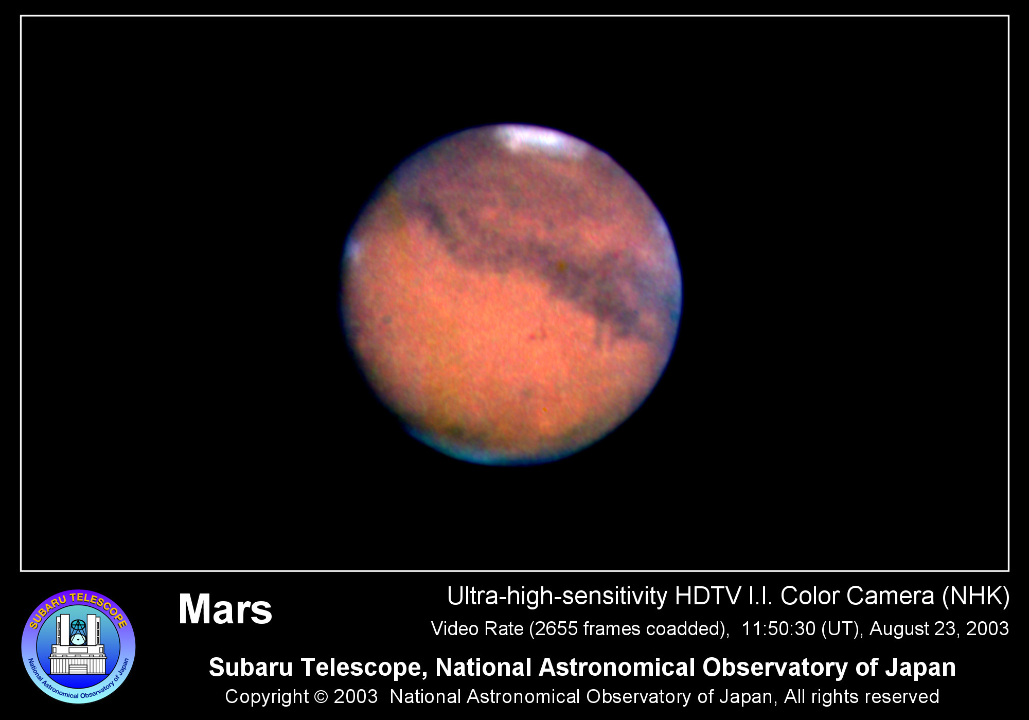 Distance : aprox. 5,600 x 104 km Angular Diameter : aprox. 25 arcseconds Detail : This image was taken four days before Mars' closest approach to Earth in 60,000 years. The video rate for this picture was one exposure every thirty seconds. [ More ] |