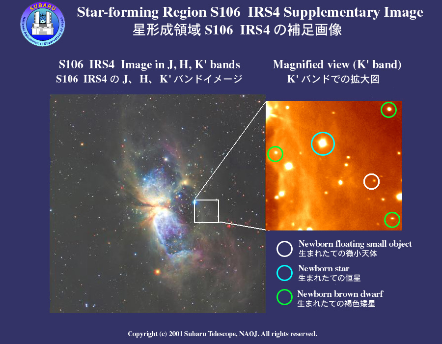 S106 の深部までとらえているこの画像からは、 IRS4 と周りの星雲内に、生まれたばかりの若い星と考えられる暗い天体を数百個発見しました。これらの天体の質量は太陽の 0.08 倍未満と軽いため、内部の水素ガスを安定に燃焼することができず、将来にわたって恒星のように輝くことはできないと考えられています。このような星は、褐色矮星 (かっしょくわいせい) と呼ばれています。
