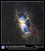 【観測条件】 天 体 名: 星形成領域 S106 IRS4 使用望遠鏡:すばる望遠鏡 (有効口径 8.2m)、カセグレン焦点 使用観測装置:CISCO (近赤外カメラ) フィルター:J バンド (1.25µm)、H バンド (1.65µm)、K' バンド (2.15µm) カラー合成:青 (J)、緑 (H)、赤 (K') 観測日時:世界時 1999 年 5 月 25 日、6 月 5 日、6 月 6 日 露出時間:6 分 (Jバンド)、4 分 (H、K' バンド) 視野:約 5 分角 画像の向き:北が上、東が左 位置:赤経 (J2000.0) = 20時27分、赤緯 (J2000.0) = +37度 (はくちょう座) |