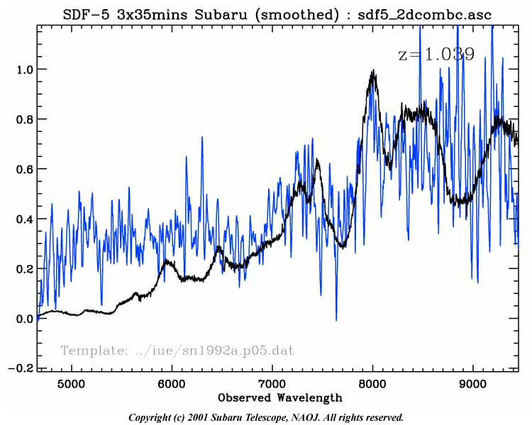 Finding enough distant supernovae to carry out this kind of research isn't easy. Supernovae shine brightly for only about a month and are exceedingly rare objects. Our own Milky Way galaxy, for example, produces only one or two supernova explosions every hundred years. The research team used the tremendous light-gathering power of Suprime-Cam on Subaru Telescope to first obtain reference images of the nighttime sky containing many thousands of faint, distant galaxies. They then obtained a second set of identical 1-hour exposures one month later to see if any of their galaxies now contained a supernova (Figure 1). They found 23 promising candidates. To confirm that the objects really are supernovae and to assign them redshifts, the team used FOCAS on Subaru Telescope a few days later to obtain spectra for the first eight candidates (Figure 2). Seven were confirmed as supernovae. These supernovae ranged in brightness from 22.8 to 24.3 magnitudes at the time of their discovery in late May and have redshifts ranging from 0.2 to 1.0. An object with a redshift of z=1.0 indicates that we are seeing it at a time when the Universe was only about 40% of its present age of ~13.5 billion years and at a distance of about 8 billion light years from the Earth. The number of supernovae so far discovered with a redshift greater than 0.9 totals just twelve, with the Subaru team providing three on their very first attempt.