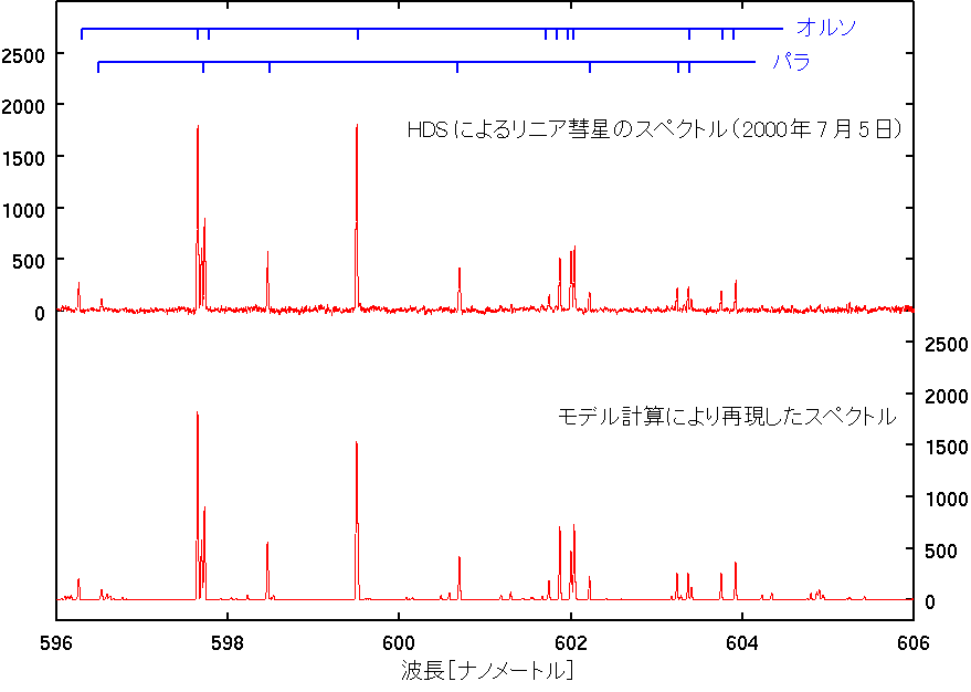 一般的にオルソ状態とパラ状態の分子は、それぞれ異なる波長の輝線を発します。ところが、それらの輝線の波長は非常に近接しているため、スペクトル中から二つを見分けることは容易なことではありません。観測チームは、HDS の高い分散能力に着目しました。分散が高いというのは、スペクトル上で接近した輝線群を分離する能力に優れていることを意味します。県立ぐんま天文台の河北秀世観測普及研究員は、分離に成功した NH2 分子の輝線群を自ら開発した新しいモデル計算方法によって再現し、リニア彗星に含まれる NH2 分子のオルソ状態とパラ状態の存在比率を求めることに成功しました。さらにその値から、元の分子であるアンモニアのオルソ・パラの比率を決定し、リニア彗星の核を構成するアンモニアの氷結温度が 28±2 ケルビンであることを導き出しました。この値は、太陽系が形成された原始太陽系星雲内において、リニア彗星が土星の軌道から天王星の軌道領域付近で生まれたことを示しています。