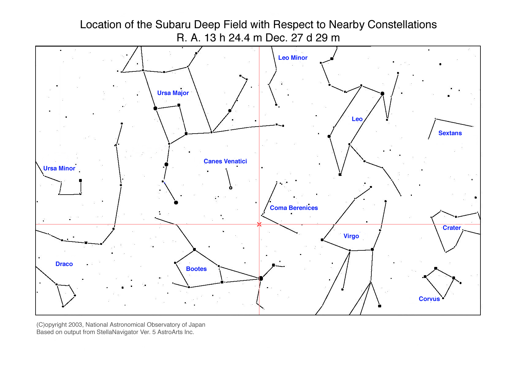 Object: Subaru Deep Field Telescope: Subaru Telescope (8.2m effective diameter) Instruments: Suprime-Cam (Subaru Prime Focus Camera), FOCAS (Faint Object Camera and Spectrograph), and IRCS (Infrared Camera and Spectrograph) Filter: i'-band (683-854nm), z'-band (834-993nm), and 908-932nm Narrow-band (NB921) Observation Dates: April - June, 2002 Exposure Time: 4.7 hours (i'), 5.8 hours (z'), and 5.0 hours (NB921) Image Orientation: North is up, east is left. Field of View: 27 arcminutes x 34 arcminutes (for SDF image) Position: R.A. 13h 24.4m, Dec. 27d 29m (Constellation: Coma Berenices) |