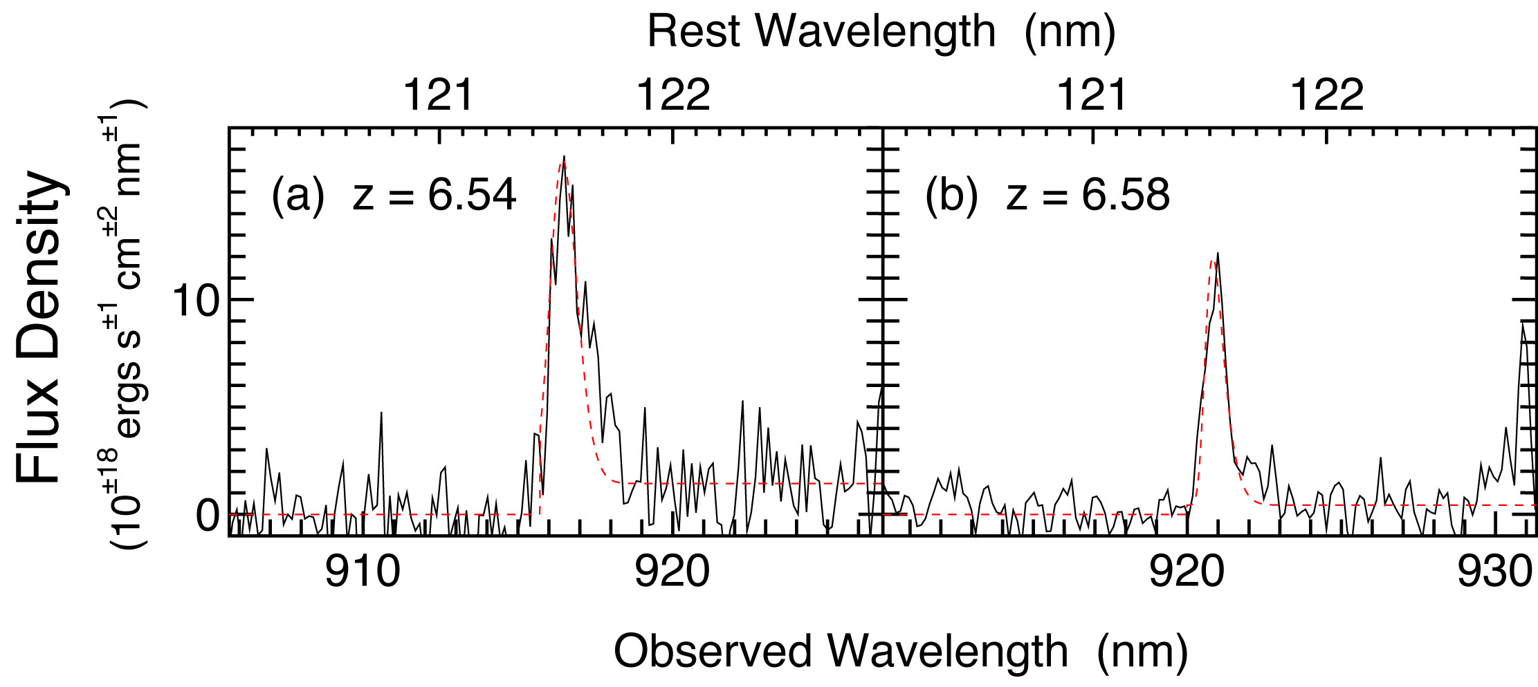 In June 2002, the team used FOCAS, the Faint Object Camera and Spectrograph on Subaru telescope, to observe 9 of the 70 candidates, and confirmed the generally red appearance and an emission line with a distinctive asymmetry in 2 objects (see figure 2), and determined that their redshifts are 6.58 and 6.54. The light from these galaxies was emitted 12.8 billion years ago when the universe was only 900 million years old. The previously observed most distant galaxy, with a redshift of 6.56, was discovered by looking at a large cluster of galaxies that can amplify light from more distant galaxies with a gravitational lensing effect. (See our press release from May 2002, http://www.naoj.org/Pressrelease/2002/05/07/index.html.)The SDF observations is the first time multiple galaxies at such a great distance have been observed, and without the help of gravitational lensing. The galaxy with a redshift of 6.58 is the most distant galaxy ever observed.