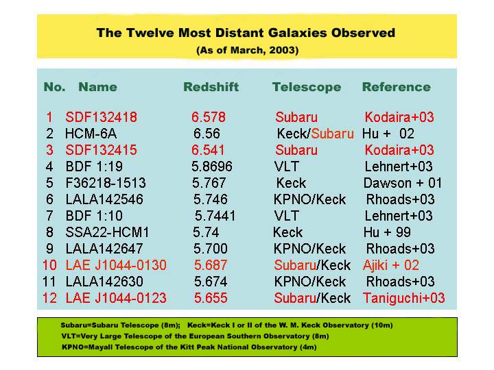 Subaru telescope has found a galaxy 12.8 billion light years away (a redshift of 6.58; see note 1), the most distant galaxy ever observed. This discovery is the first result from the Subaru Deep Field Project, a research project of the Subaru Telescope of the National Astronomical Observatory of Japan which operates the Subaru telescope. The Subaru Deep Field (SDF) project team found approximately 70 distant galaxy candidates by attaching a special filter designed to detect galaxies around 13 billion light years away on a camera with a wide field of view. Follow-up observations with a spectrograph confirmed that two out of nine of the candidates are in fact distant galaxies. One of these is the most distant galaxy ever observed. This discovery raises the expectation that the project will be able to find a large number of distant galaxies that will help unravel the early history of the universe in a statistically meaningful manner.