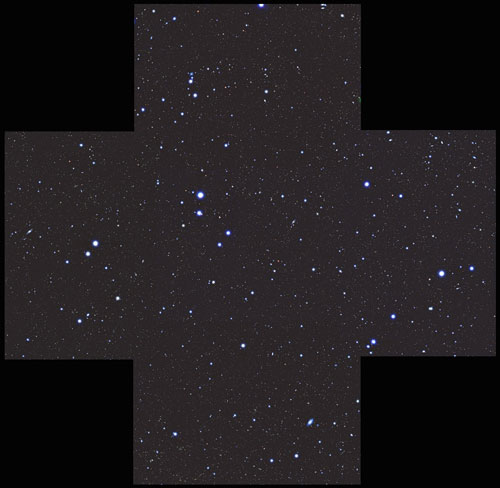 A color composite image of Subaru/Suprime-Cam B (0.4 µm), R (0.7 µm), and z′-band (0.9 µm) data of the Subaru/XMM-Newton Deep Field. Five Suprime-Cam pointings cover a 1.3° x 1.3° centered at α = 02h18m, δ = −05° 00′ (2000.0). Over two hundred hours of observing time on the Subaru telescope was devoted to the SXDS, including i′-band (0.9 µm) observations. The typical seeing in the final data is 1.5in. The B-band images reach a depth of 28.3 magnitudes, several hundred million times fainter than what can be seen with the naked eye.