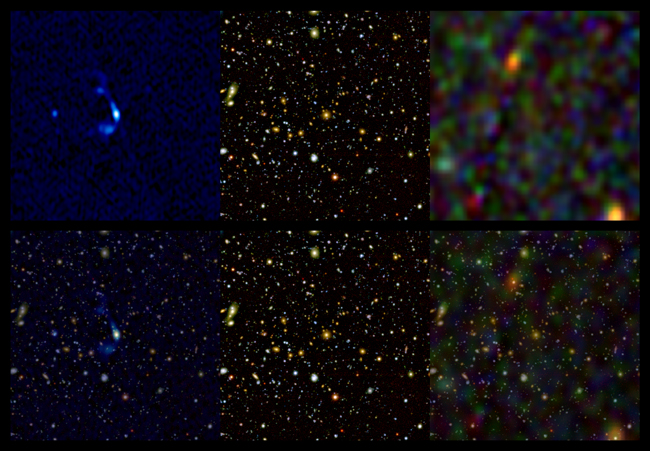 A multi-wavelength view of the galaxy SXDF021823.6-052501. The three panels on the top row are the radio (VLA), visible (Subaru), and X-ray (XMM-Newton) data of from left to right. Each panel is 400in x 400in. On the bottom row, the radio and X-ray data are superimposed on the visible data. In the optical, SXDF021823.6-052501 appears to be the largest member of a small group or cluster of galaxies. There is no X-ray source associated with it, but it coincides with the peak of a bright and complex radio source. The X-ray sources in this field are associated with blue point-like objects in the visible image, except for one source that appears to be centered on a red galaxy. Such correlations and anti-correlations help astronomers understand the processes that drive galaxy evolution.