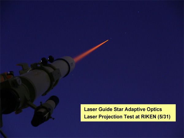 The key issue of the laser guide star system has been the development of a powerful sodium laser yielding the 589 nm sodium D line (Note 4). NAOJ and MegaOpto Co., Ltd., have been developing an all solid state, sodium laser under the guidance of the Solid State Device Unit (Tomoyuki Wada, Unit Leader) of RIKEN (Note 5) and succeeded in launching the orange laser beam into the sky using the fiber relaying system at the RIKEN campus in June.