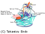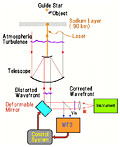 3. Subaru's Laser Guide Star Adaptive Optics system: An adaptive optics system instantaneously measures the wavefront distortion due to the atmospheric turbulence and compensates for the effect by driving a "deformable mirror" in real time. The laser guide star generation system consists of the laser, relaying optical fiber, and the launching telescope mounted on the back side of the secondary mirror of the Subaru telescope (Larger Image) |