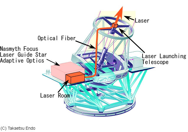 NAOJ is currently developing a new adaptive optics system with 188 control elements to be installed at the Nasmyth focus. However, the both the old and the new system requires a bright guide star near the target field to measure the atmospheric turbulence. Only a few lucky targets can enjoy these sophisticated technologies if the system must rely on existing "natural" stars in the sky (Note 2).
