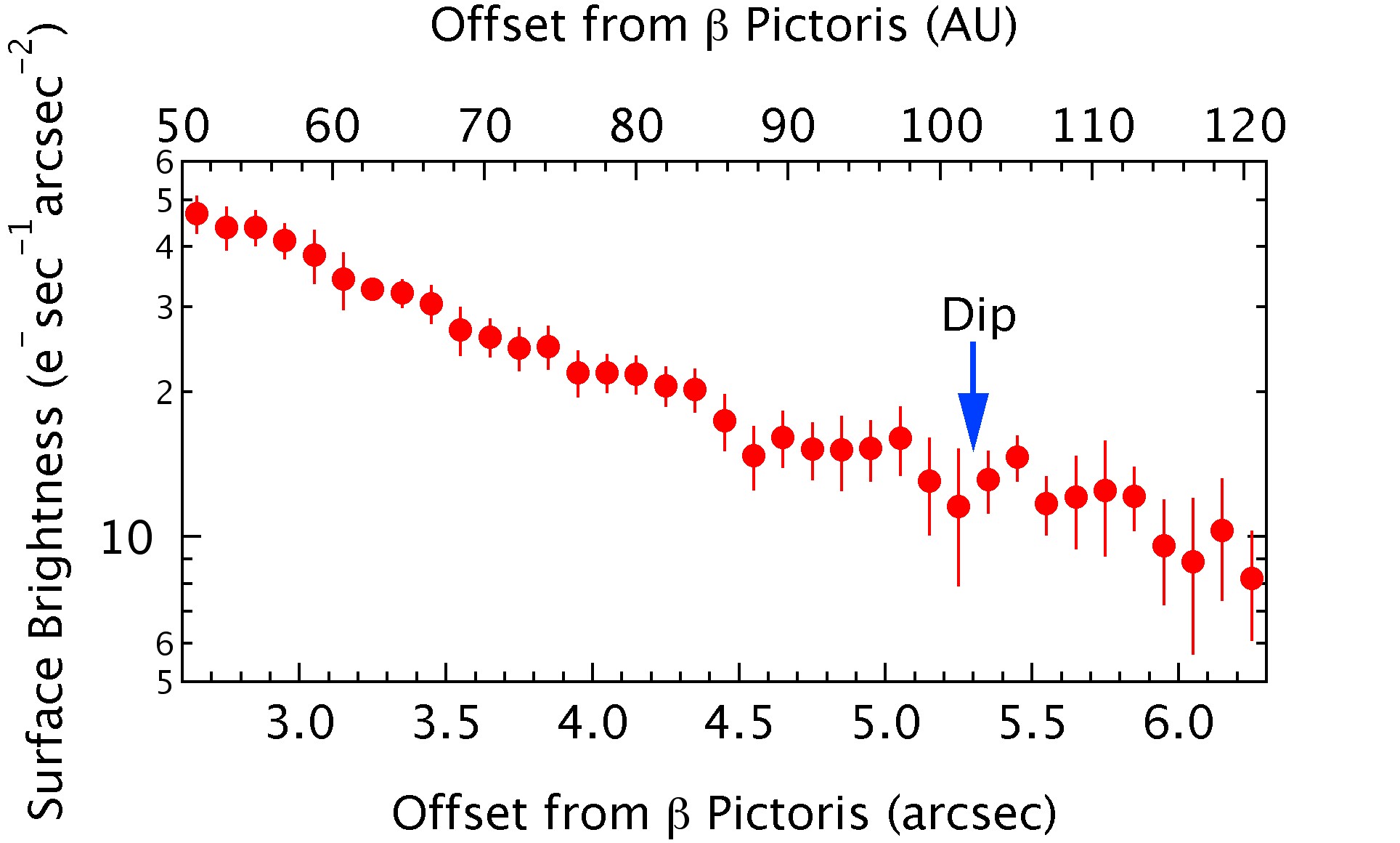 Figure 3: The brightness of the upper left portion of the disk as a function of distance from the central star. The brightness doesn't simply decrease, but shows slight modulations. These subtle peaks and troughs correspond to regions of slightly higher and lower density in the disk. The higher density regions probably correspond to the location of planetesimals whose collisions produce the dust reflecting the starlight. Note that there is a dip at around 100 astronomical units.