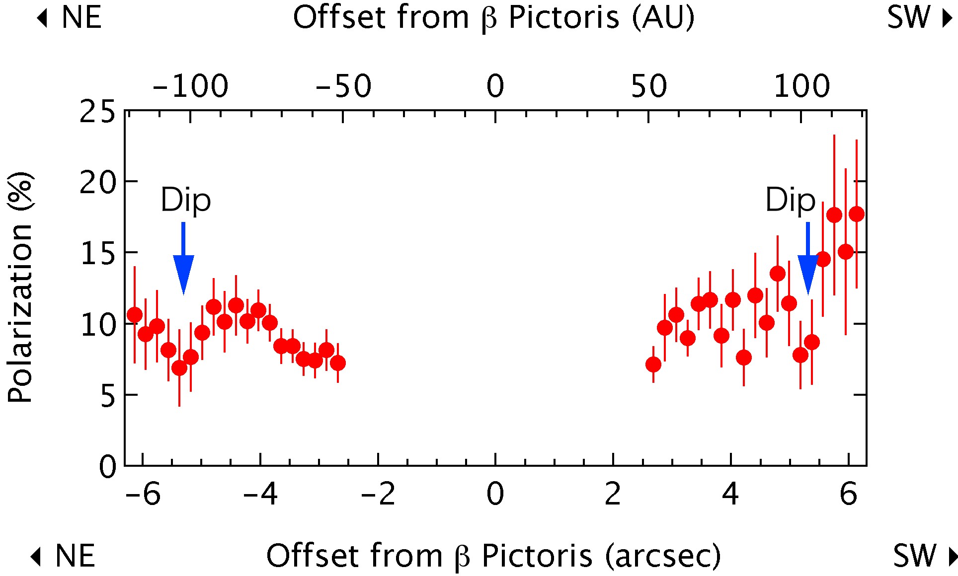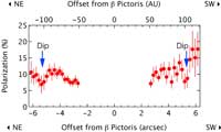 A similar analysis of how the amount of polarization changes with distance from the star shows a decrease in polarization at a distance of one hundred astronomical units (an astronomical unit is the distance between Earth and the Sun). (Figure 4) This corresponds to a location where the brightness also decreases, suggesting that at this distance from the star there are fewer planetesimals.