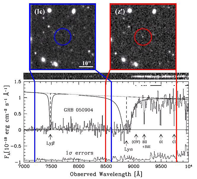 さらに星形成史だけでなく、GRB を用いた様々な初期宇宙の探求が可能である。特に重要なのは、「宇宙再電離」である。誕生直後の宇宙は高温のためプラズマ状態 (電離状態) だが、誕生後数十万年で温度低下により中性状態になったことがわかっている。しかし、現在の宇宙は再び電離状態にあり、宇宙誕生後 10 億年ごろに誕生した最初の星々により「再電離」が起きたと考えられるが、まだよくわかっていない。我々は、平成18年9月に発生した GRB050904 について、すばる望遠鏡の観測で光学スペクトルを取得し、これまでで最遠方の GRB であることを明らかにした (注2)。さらに、この光学スペクトルの詳細な理論解析により、宇宙が誕生後9億年ですでに電離されていたことを初めて明らかにした (注3)。GRB によって初期宇宙に関する情報が初めて得られた、画期的事件となった。
