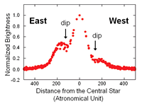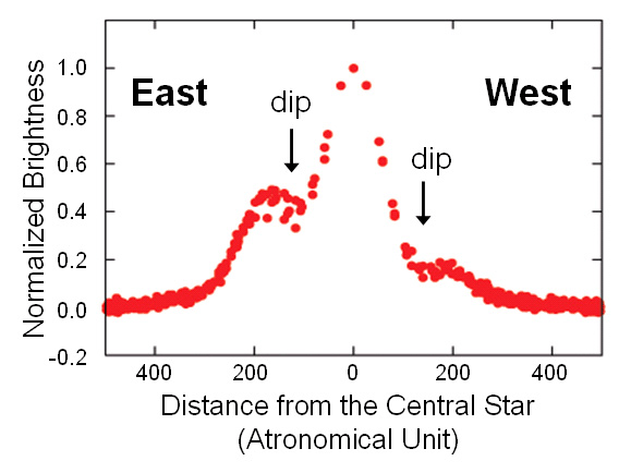 Figure 3: A graph of the brightness of the disk in 24.5 microns and a function of distance from the central star in astronomical units. The dips in brightness on either side of the central star indicate a gap in the disk. (Enlarge)