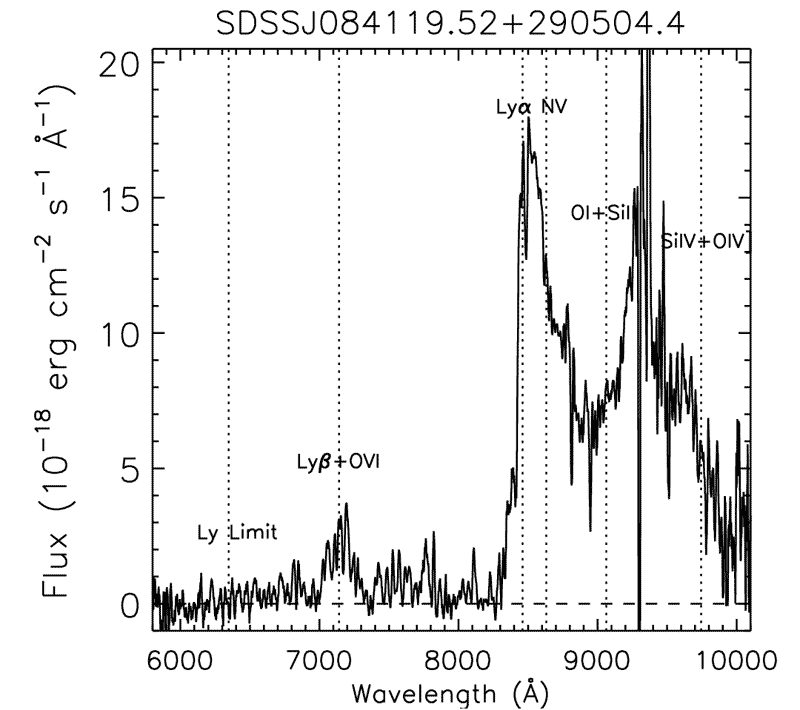 Figure 1: The spectrum of the quasar from Subaru telescope's Faint Object Camera and Spectrograph. The observed wavelengths of hydrogen emission lines indicate a redshift of 5.96, which corresponds to a distance of 12.7 light years. (Enlarge)